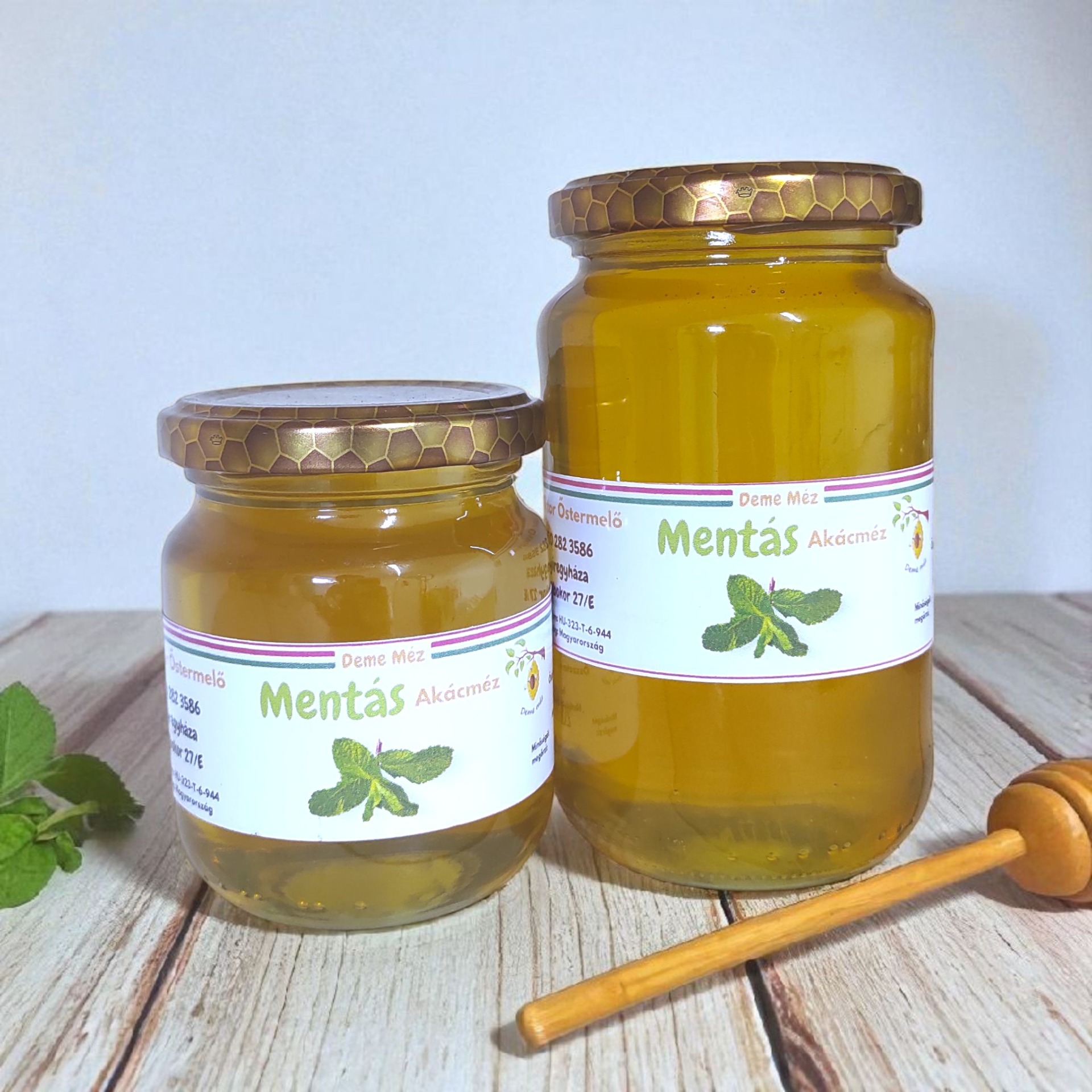 Úgynevezett "menta ágyon" van az akácméz. Folyamatosan forgatni kell akár naponta többször az 5 literes üvegeket, hogy mindig mézbe kerüljön a mentalevél. Közel egy HÓNAPIG tart ez a folyamat, míg kellőképpen kiszívja belőle azt a csodálatos aromát! Azután nagyon sűrű szűrőn folyatjuk át, így teljesen ki tudjuk szedni belőle a leveleket. Egy egészen aromás, isteni finom mentás finomság.