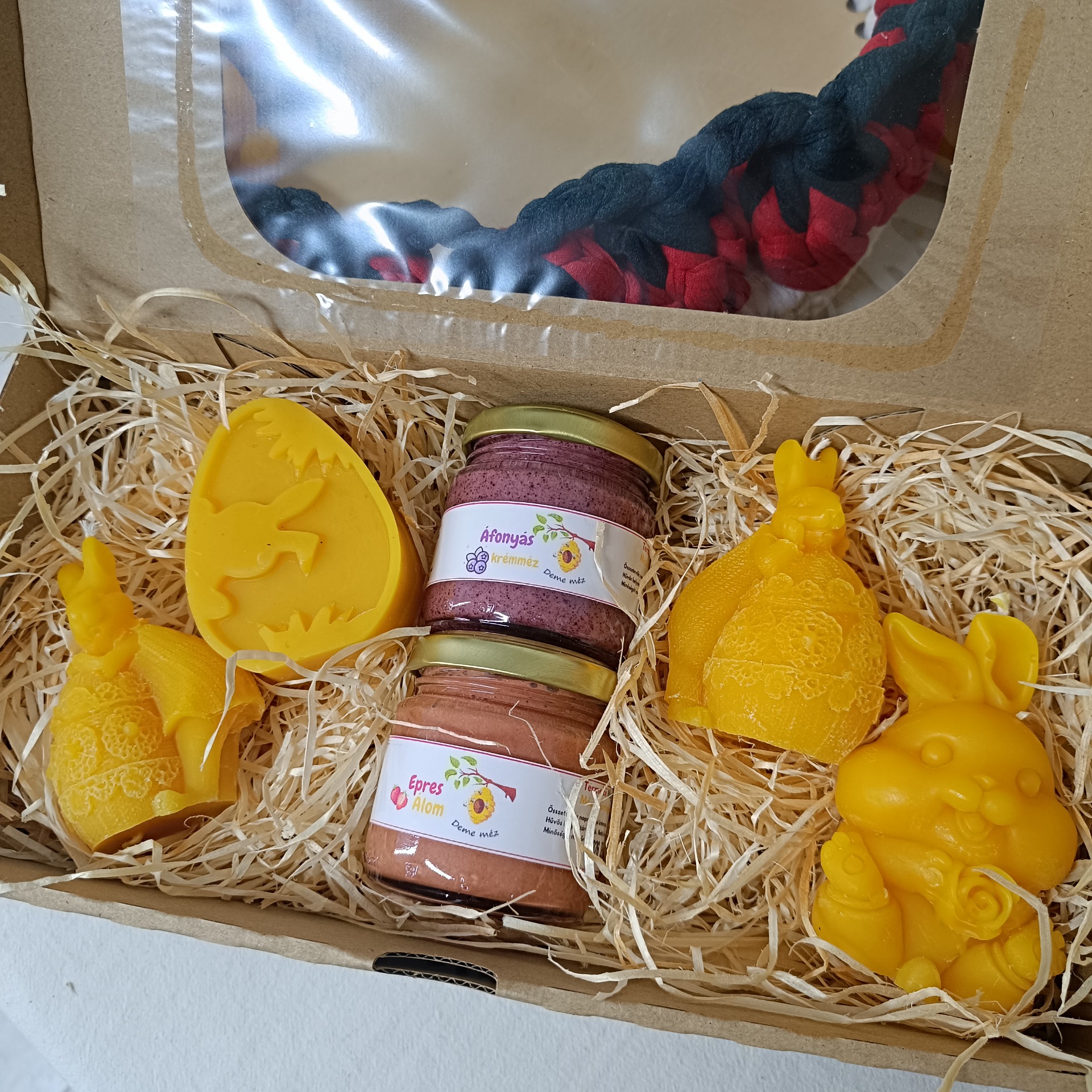 Desszertmézek ünnepi díszdobozban, középen tojás méhviasz gyertyával.