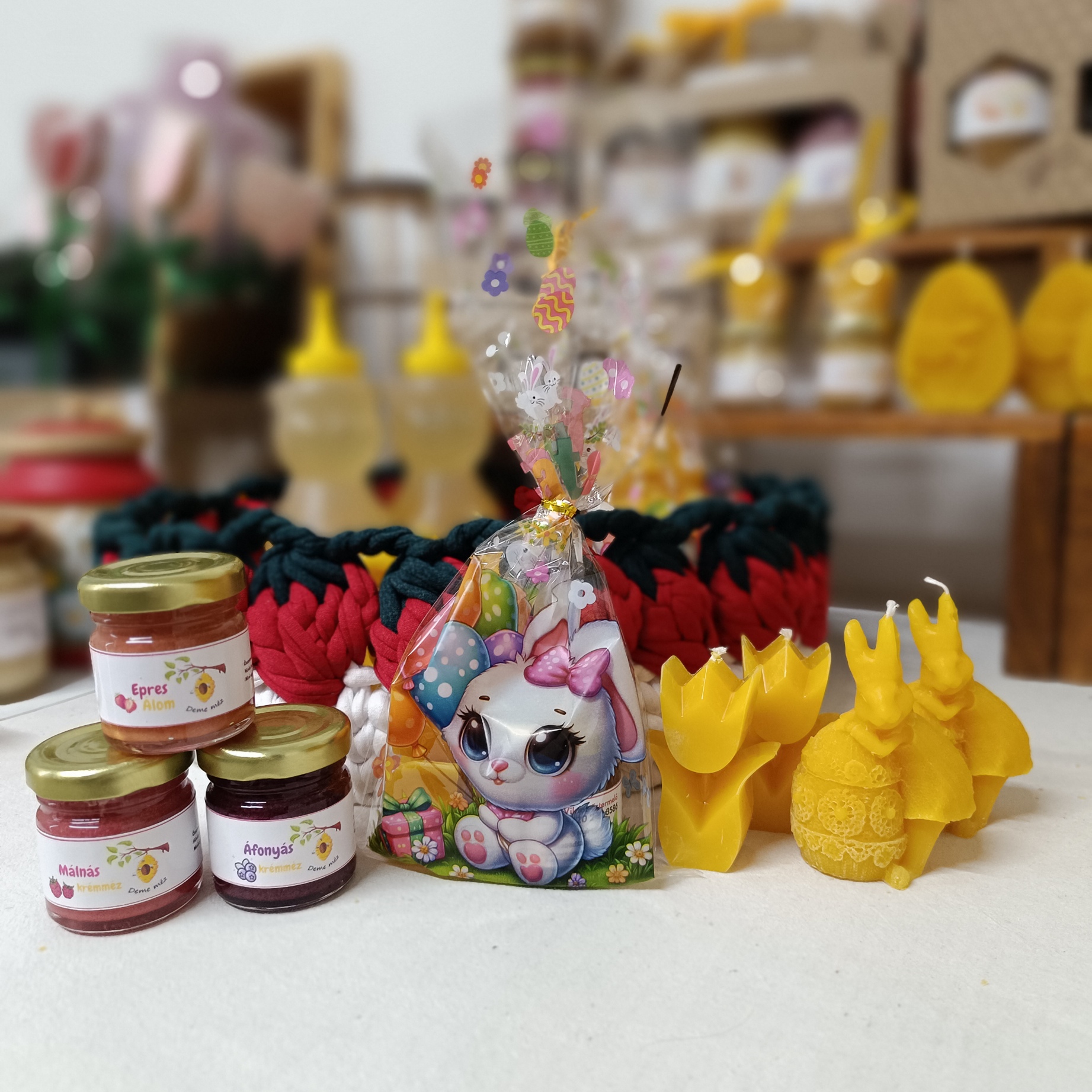 Válogasd össze nyuszis csomagodat finom mini desszetmézből és figurás méhviaszgyertyából.