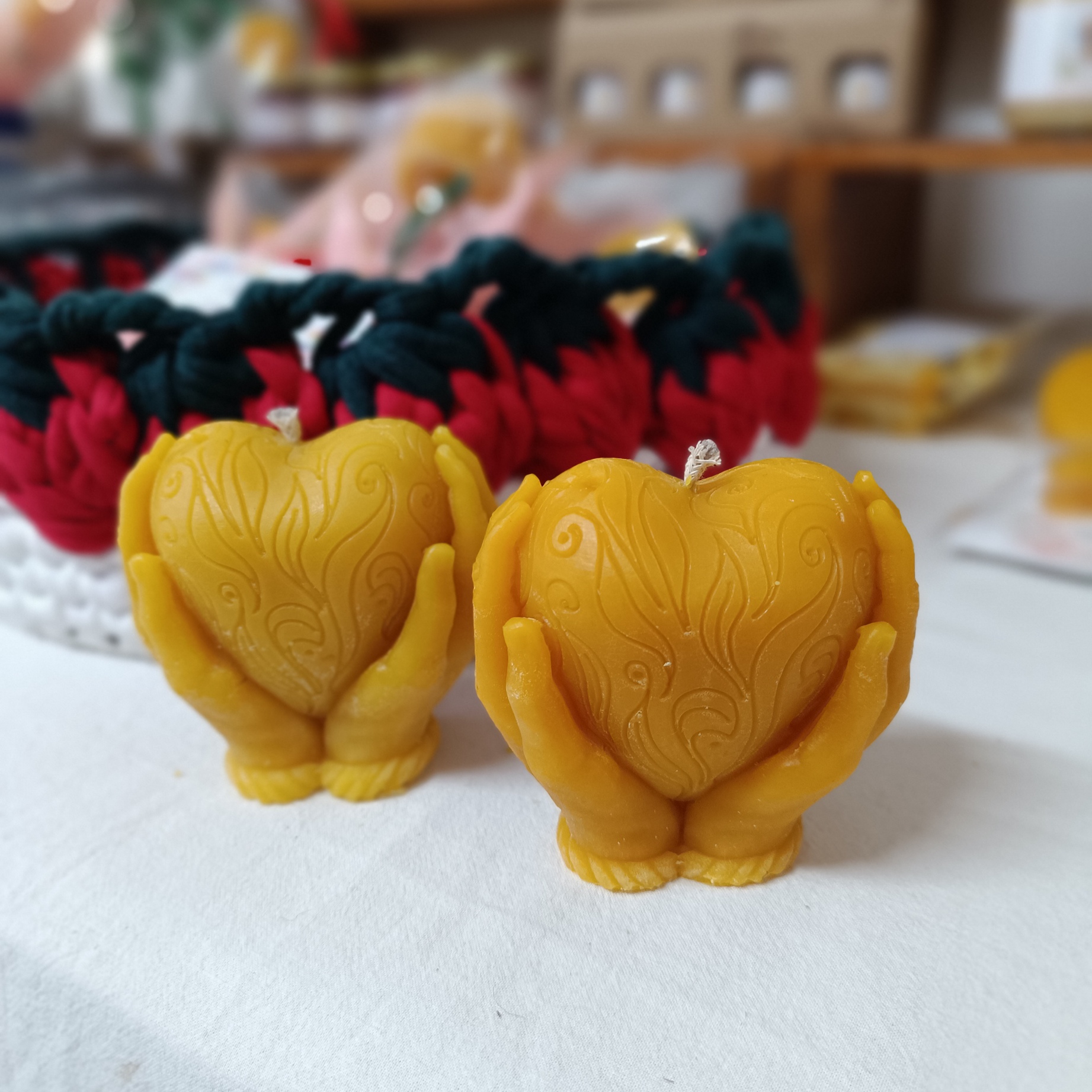 Szívet tartó kéz méhviasz gyertya